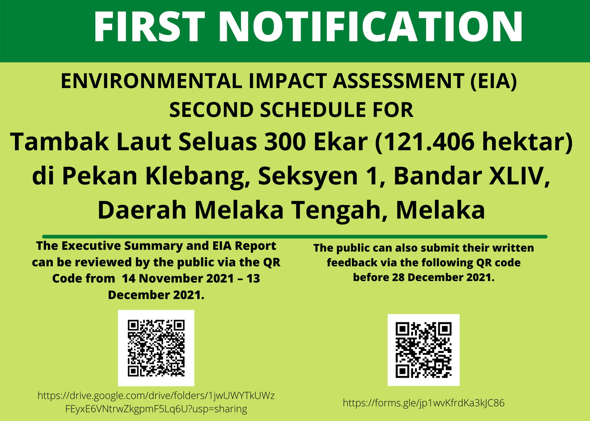 The Executive Summary and EIA Report can be reviewed by the public via the QR code from 14th November 2021 to 13th December 2021. The public can submit written feedback via another QR code as shown in the notification. Furthermore, the public also can view the notification that has been published on BH and NST digital newspaper on 14th, 15th and 16th November 2021.